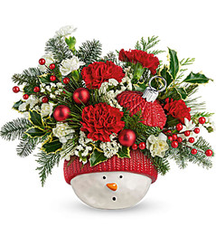 This year, the container is a snowy Christmas village scene! My favourite is Teleflora's Snowy Village Bouquet. It includes one of my favourite additions to a Christmas arrangement - snow tipped pine cones! With the bouquet shown to the left, you get a great assortment of fragrant greenery - including fresh eucalyptus and fresh pine. It has romantic red roses, and classic red mini carnations, which make a great combination! You can place an order for local pickup or delivery of this arrangement in Edmonton, St. Albert or Sherwood Park here.