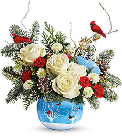 Our most popular Christmas arrangement, by far, is our ornament arrangements! You may be wondering what exactly this is. Teleflora carries a container that it's partner florists can purchase and sell in their shop. Almost every year they come up with a different variation of their ever-popular ornament container.